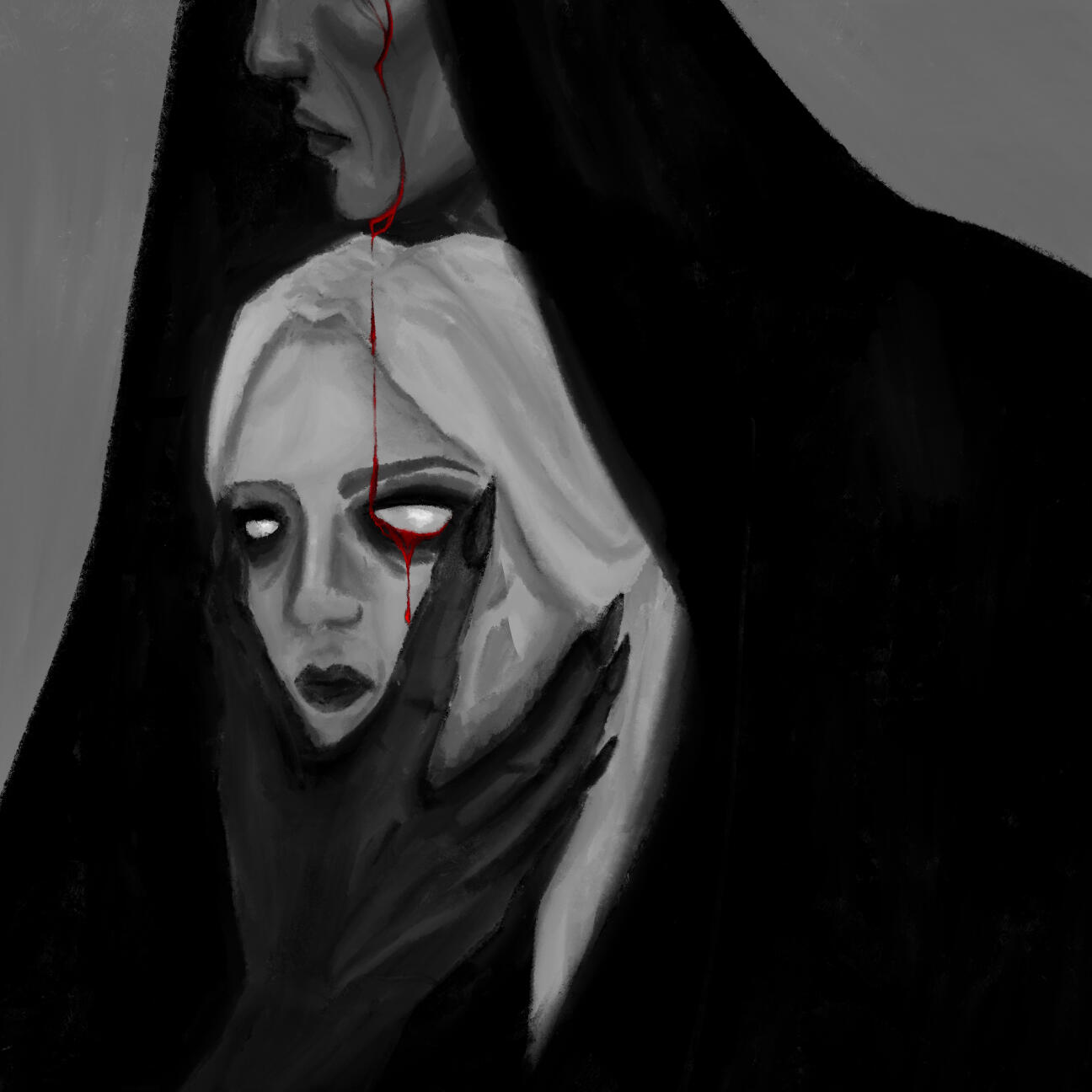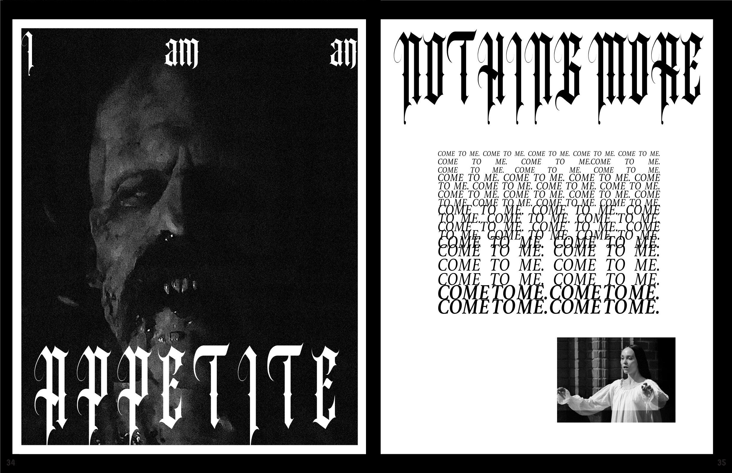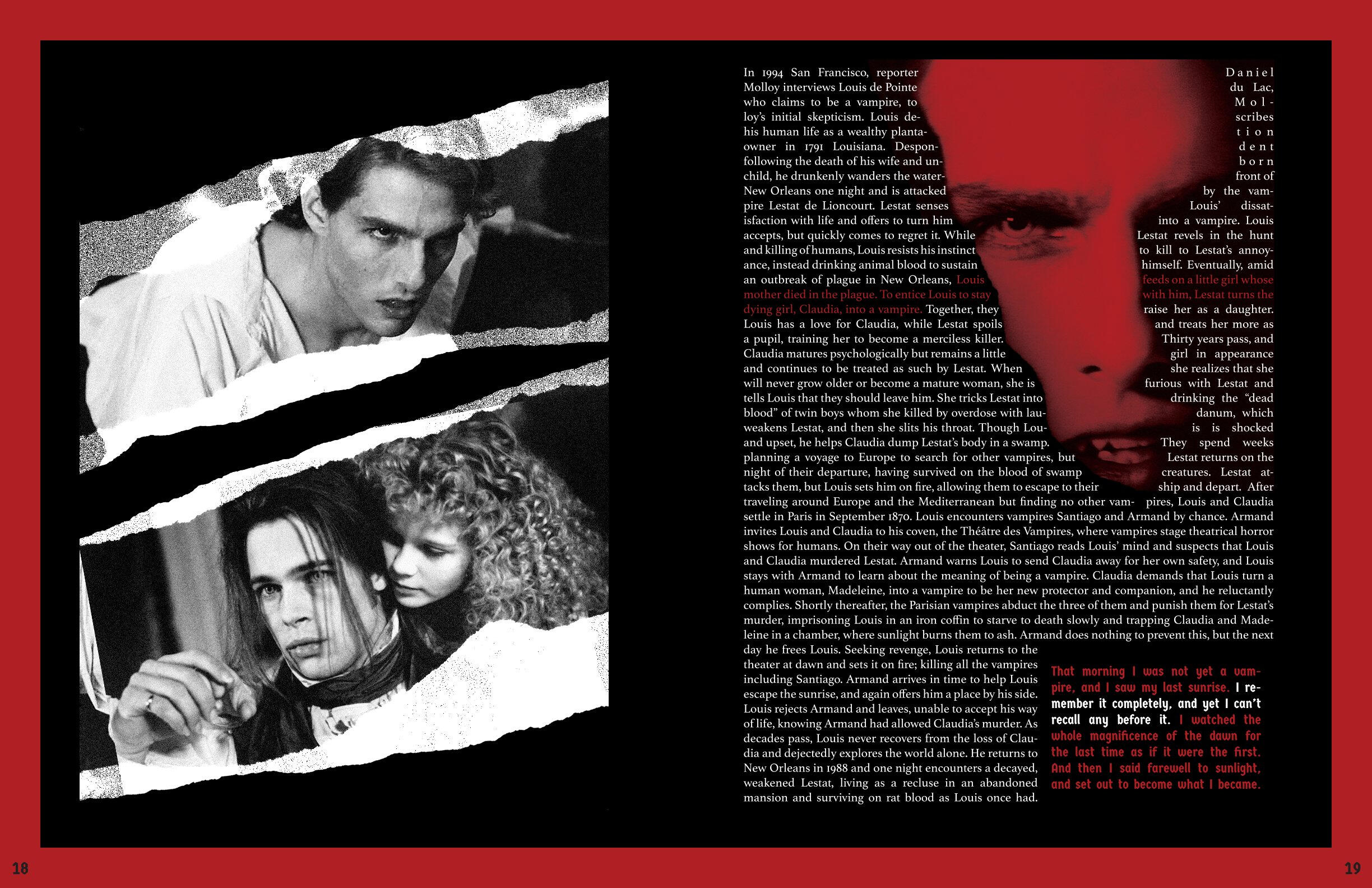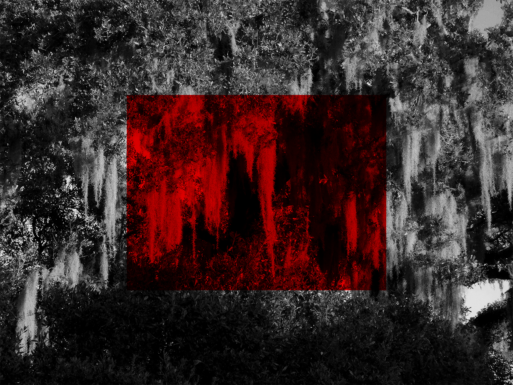 The art that I create has elements of horror and the macabre portrayed through fantasy and the supernatural. My influences are from film, TV shows, and games; I had always loved these subjects ever since I was a kid, when I dressed up as Monster High’s vampire character, Draculaura, for Halloween. The main horror inspiration that flows throughout all of my work is NBC’s Hannibal and AMC’s Interview with the Vampire, by the way they portray horror as beauty alongside their appraisal of the arts.In order to portray these atmospheres in my work, the colors I utilize are an achromatic color scheme alongside reds, either being the dominating color or the highlight. I like to utilize charcoal, or charcoal texture, in my figure drawing and portraiture of human or humanoid creatures. I also photograph liminal, southern landscapes such as bayous and forests, cemeteries, bones, and Catholic churches. With some of those photographs, or with found photos, I digitally manipulate them to make collages with typography surrounding the motif of death.